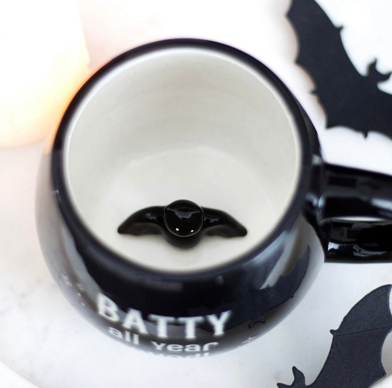 Feeling a bit batty? This fun peekaboo mug is sure to show off your dark and quirky personality with a special hidden surprise! Features 'Batty all year round' text on a black base and a charming 3D bat interior to start (or end) your day with a smirk. 500ml capacity. Do not microwave. Handwash only.