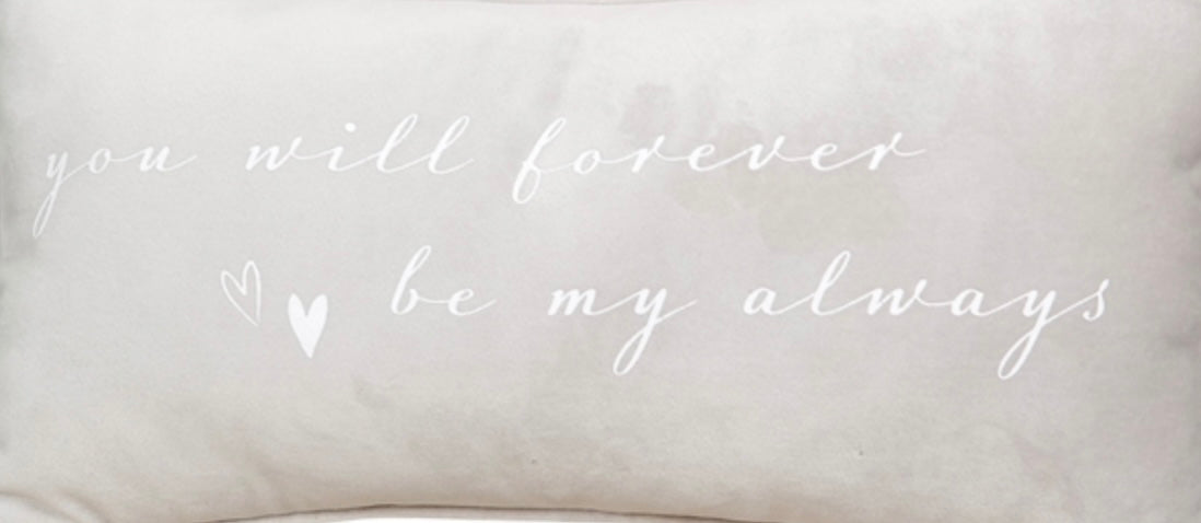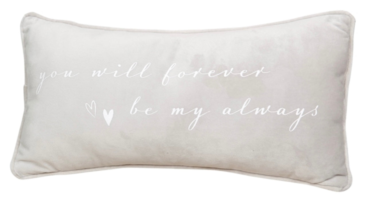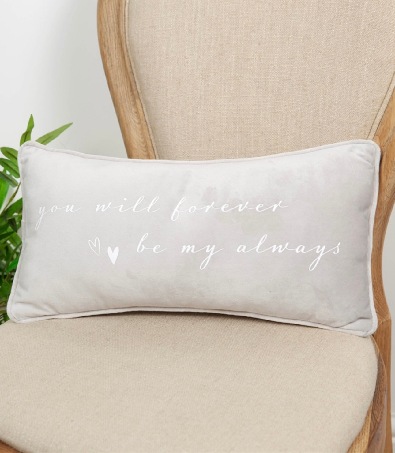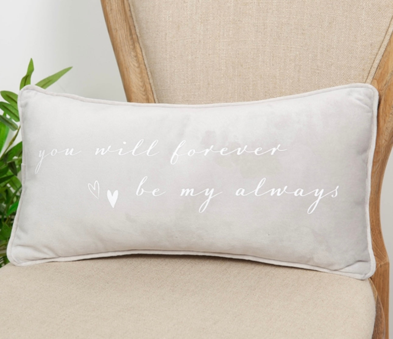 Plush Grey Cushion With White "You Will Forever Be My Always" Text. A wonderful gift for Valentines Day or Wedding Day.