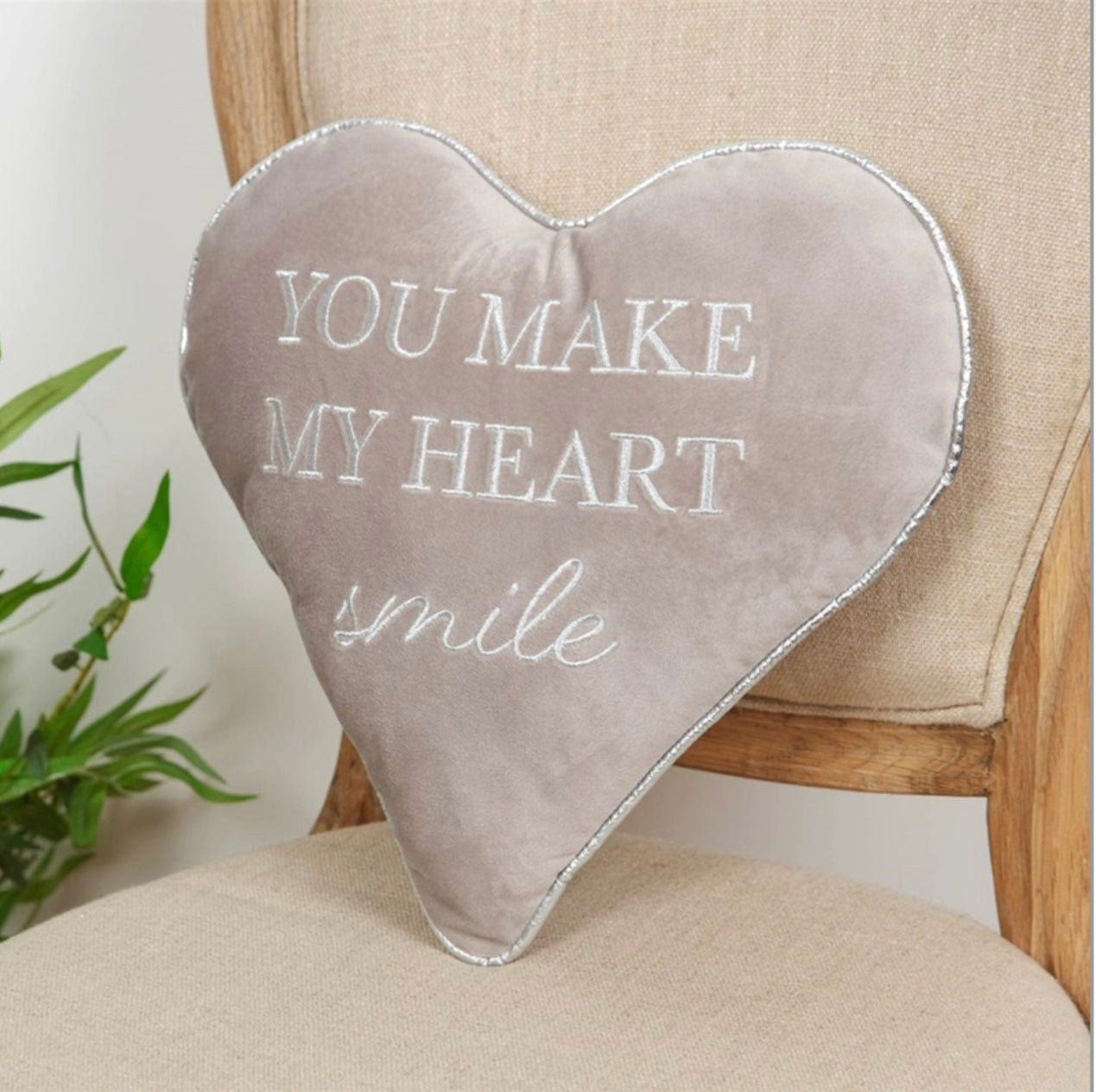 Plush Grey Heart Cushion With 'You Make My Heart Smile' Text. Perfect for Valentine’s Day.