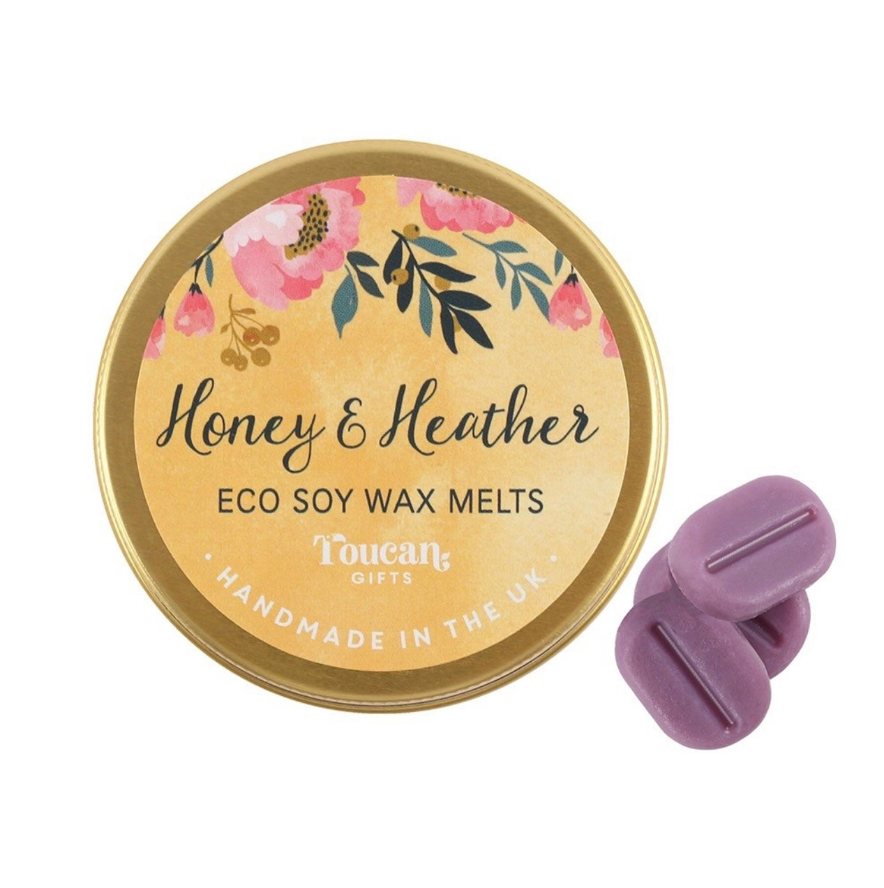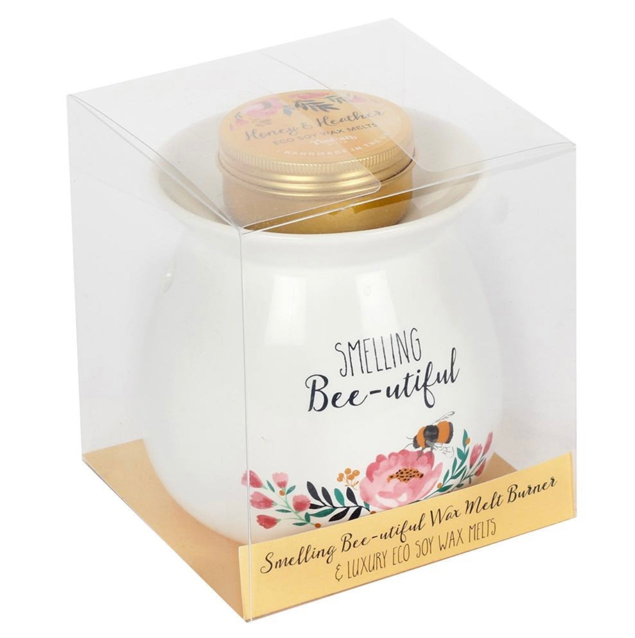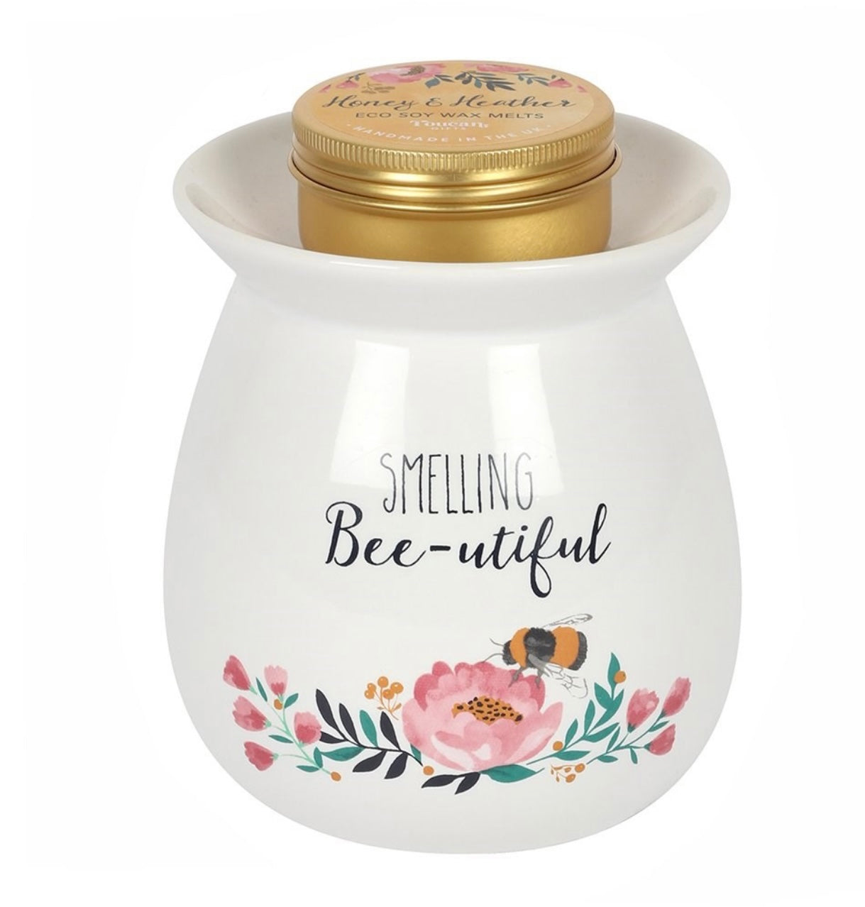 A gorgeous gift set for scenting the home, this item includes a large white ceramic oil burner with a floral 'Smelling Bee-utiful' design and a tin of Honey and Heather fragranced soy wax melts which have been made in the UK.